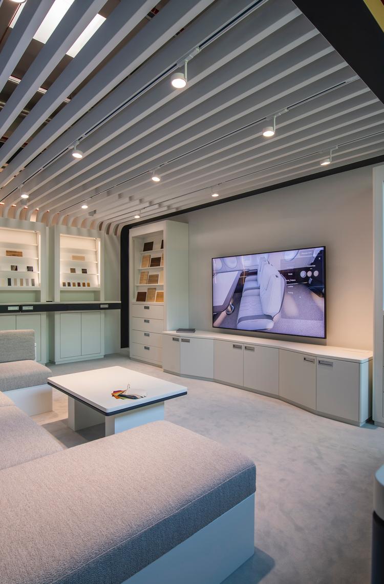 The studio dedicated to ACJ customers showcases a real-size section of the ACJ TwoTwenty cabin, offering double the space and volume of any competitor aircraft, so they can customize it to make it their own. With an integrated use of virtual reality technology complemented by configurable customer-specific mock-ups, all these assets available under one roof make the creative studio a unique and attractive one-stop-shop for interior design.